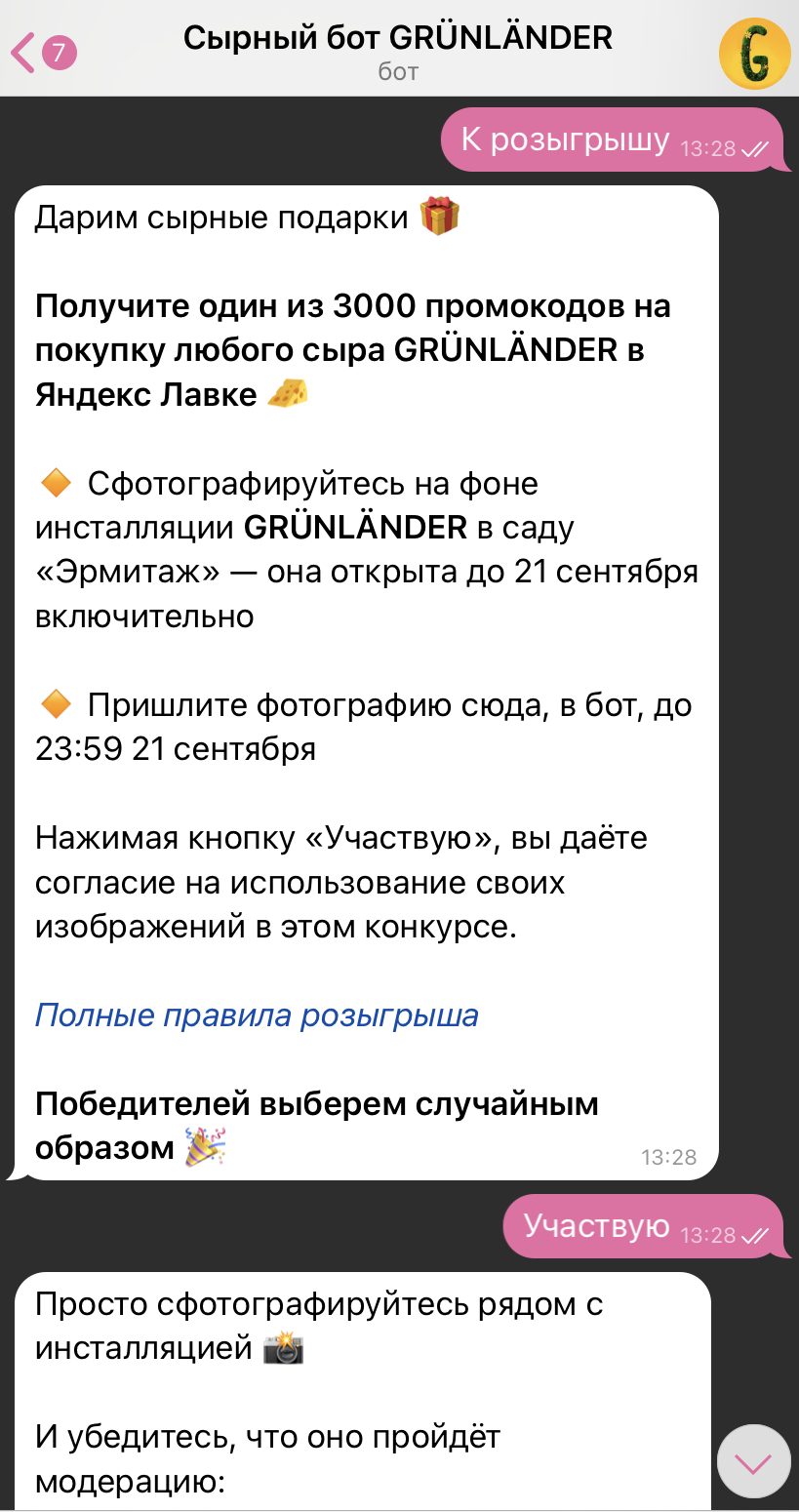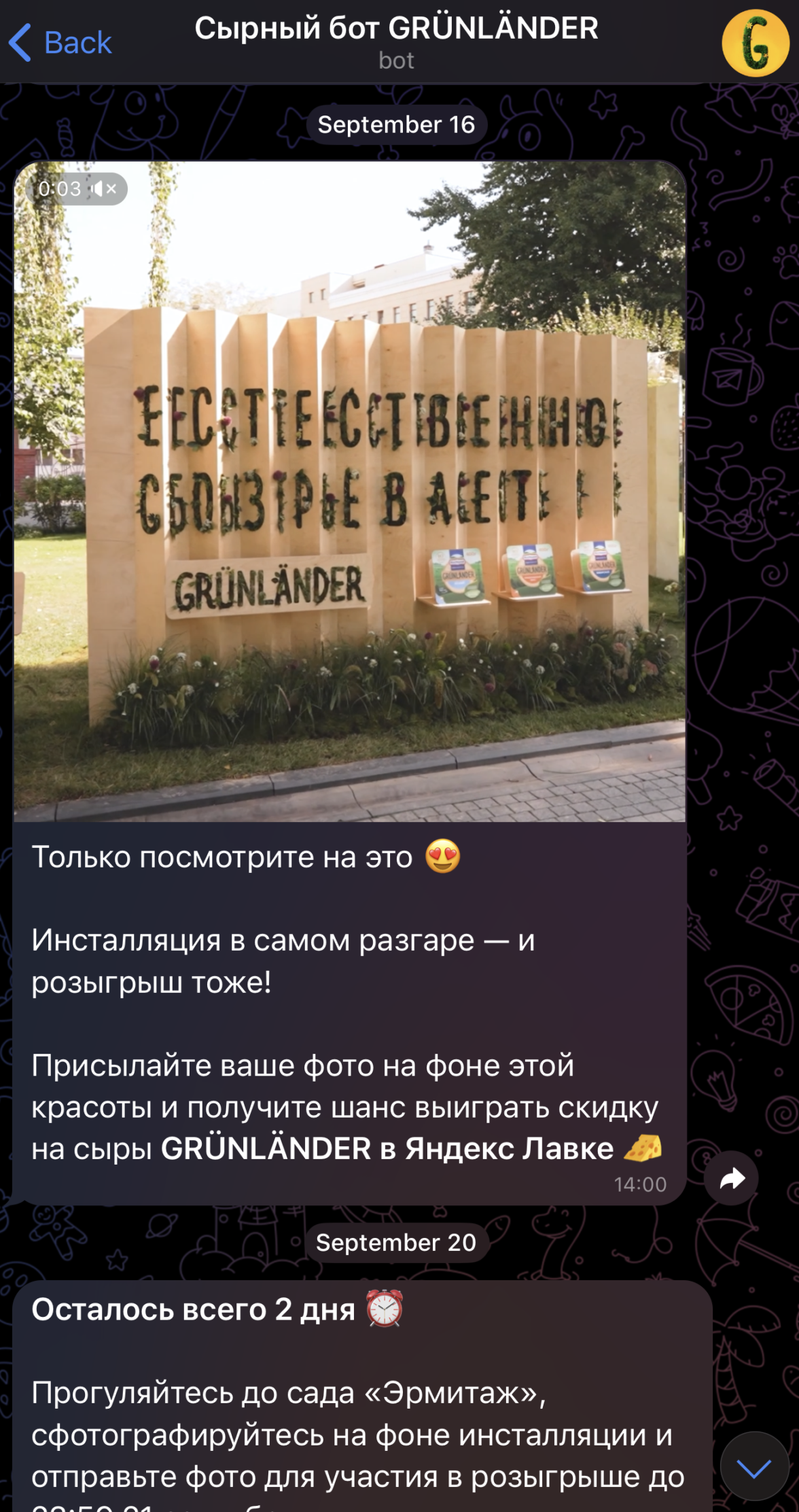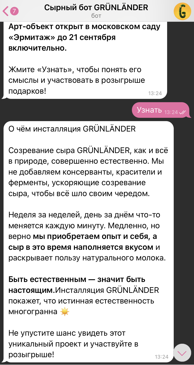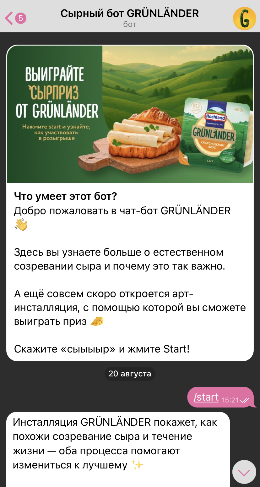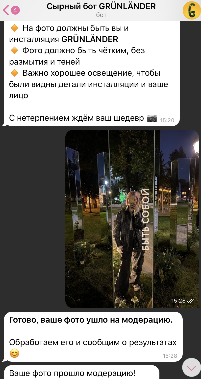 В бот попадали пользователи, заинтересованные в акции. Бот рассказывал об идее бренда, о продукции Grünländer и механике розыгрыша. Чтобы получить скидку, нужно было сфотографироваться с инсталляцией и загрузить снимок в бот.