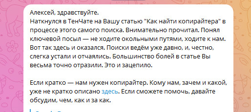 На первом отсейте тех, кто ну вообще никак не подходит. Копирайтер с трехдневными курсами за плечами — мимо. Человек без портфолио — туда же. Специалист, который изъясняется витиевато, сыпет общими словами и льет воду — не специалист, для бизнеса по крайней мере.
