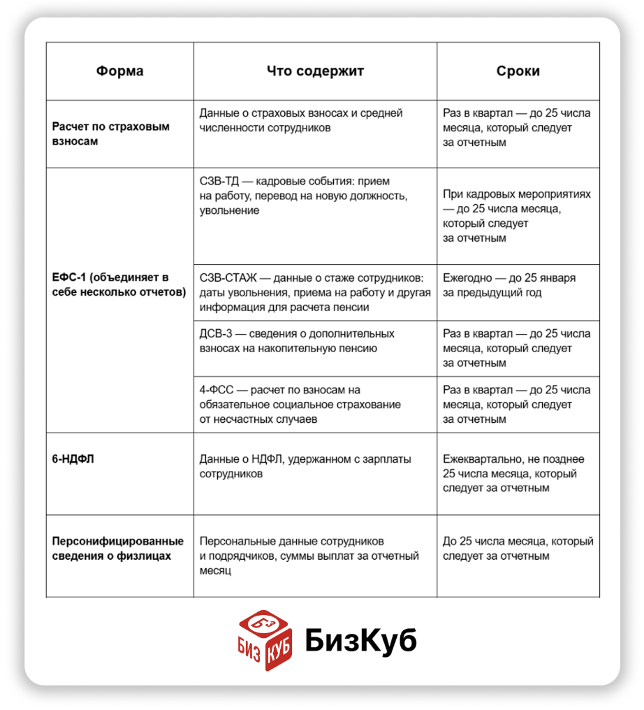 Если у предпринимателя появляется хотя бы один сотрудник, к налоговым формам добавляется отчетность по персоналу. Она обязательна, даже если люди в штате оформлены по срочному договору или работают неполный день. Для удобства составили таблицу с формами, которые должен сдавать ИП со своим штатом.