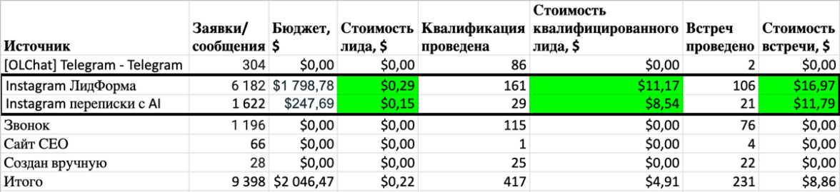 Мы не опасаемся, что нас засыплет обращениями — входящие лиды обрабатываются AI. Эксперимент продолжается неделю, мы наблюдаем, что лиды, поступающие через переписки, стоят в два раза дешевле, чем лиды из форм. Решаем масштабировать эксперимент на месяц. Результаты эксперимента за месяц представлены в таблице ниже: