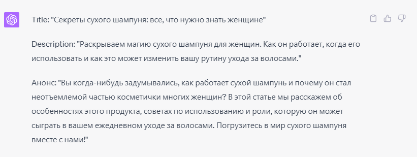 Генерация мета-данных для текстов. Мета-данные TITLE и DESCRIPTION, а также анонс вашей статьи можно также генерировать с помощью ChatGPT. Для этого необходимо отправить соответствующий запрос, например: «Сгенерируй title, description и анонс для статьи “Сухой шампунь для женщин”. Title — до 140 символов. Description — до 220 символов, анонс — до 300 символов».