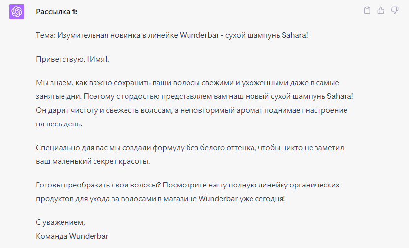 Электронная почта по-прежнему очень эффективна для привлечения клиентов. Попробуйте эту подсказку, чтобы начать кампанию по выпуску продукта: «Ты e-mail маркетолог в стартапе органического ухода за волосами Wunderbar. Напиши пять убедительных рассылок по электронной почте о нашем новом сухом шампуне Sahara. Целевая аудитория — женщины старше 40 лет.