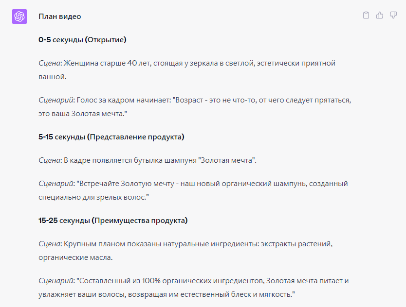 Можно также использовать эффективный сценарий для видео Reels: «Ты работаешь маркетологом в стартапе по производству органических средств по уходу за волосами Wunderbar. Напишите план 45-секундного видео о новом органическом шампуне для женщин старше 40 лет под названием “Золотая мечта”. Включи сценарий для видео и описание содержания видео».