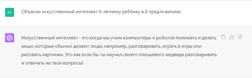 В то время как «Объясни искусственный интеллект 5-летнему ребенку в 2 предложениях» указывает точный результат, который вы надеетесь увидеть для своей аудитории: