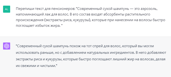 • Переписывать контент под ToV (Tone of Voice), то есть, переделывать текст под конкретную аудиторию, например, попросим переписать текст с командой «перепиши текст под такую-то аудиторию»: