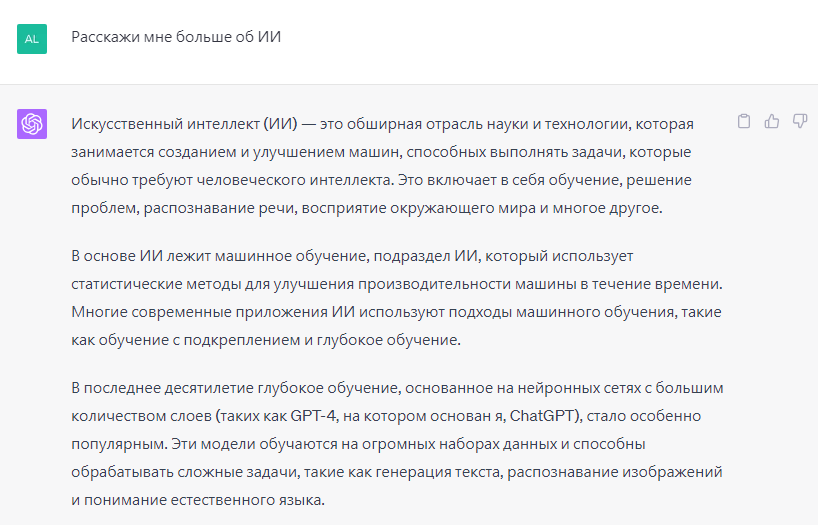 Например: промт «Расскажи мне больше об ИИ» отобразит большой абзац текста, объясняющий различные области искусственного интеллекта: