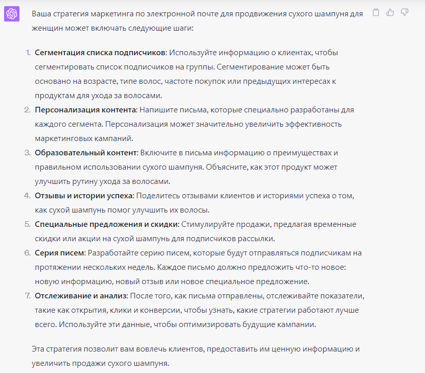 ChatGPT может помочь в создании маркетинговой стратегии. Запрос на маркетинговую стратегию может быть таким: «Придумай маркетинговую стратегию для e-mail рассылки на тему: “Сухой шампунь для женщин”».
