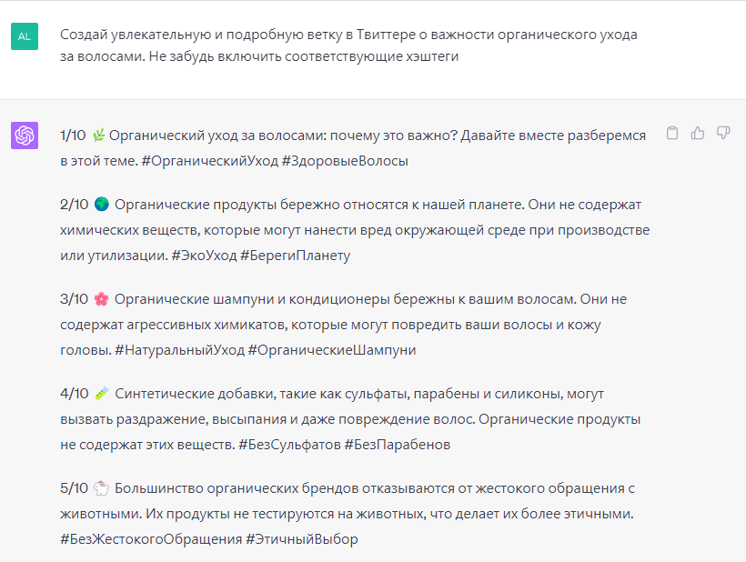 Еще один пример: «Создай увлекательную и подробную ветку в Твиттере о важности органического ухода за волосами. Не забудь включить соответствующие хэштеги».
