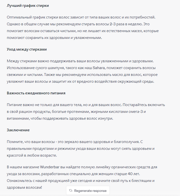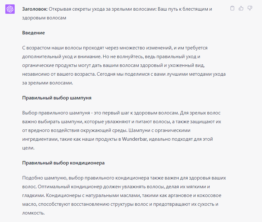 Чем конкретнее вы будете в своем промте, тем менее общими вы будете по сравнению с вашими конкурентами! «Ты занимаешься контент-маркетингом в стартапе Wunderbar, занимающемся органическим уходом за волосами. Напиши сообщение в блоге из 800 слов о лучших методах ухода за зрелыми волосами. Целевая аудитория — женщины старше 40 лет. Включи следующие разделы: “Введение”, “Правильный выбор шампуня”, “Правильный выбор кондиционера”, “Лучший график стирки”, “Уход между стирками”, «Важность ежедневного питания Заверши призывом к действию, чтобы посмотреть в магазине Wunderbar полную линейку органических средств по уходу за волосами для женщин старше 40 лет».