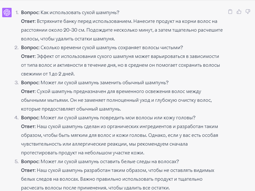 Также ИИ может помочь вам в генерации ЧАВО. Для этого нужно дать команду: «создай список из вопросов и ответов для сайта Х».