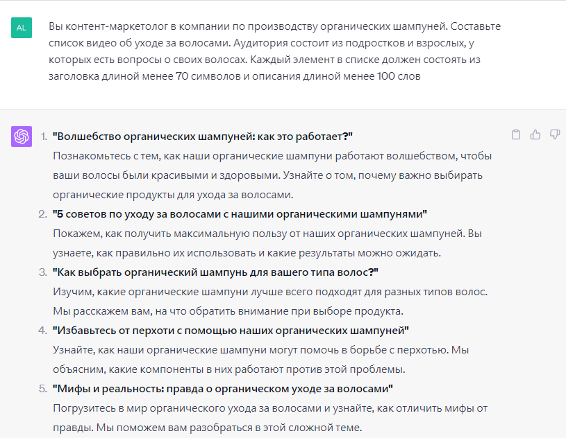 В первую очередь, ChatGPT может помочь вам в генерации идей. Например, можно использовать следующую подсказку для идей видеоконтента: «Ты контент-маркетолог в компании по производству органических шампуней. Составь список видео об уходе за волосами. Аудитория состоит из подростков и взрослых, у которых есть вопросы о своих волосах. Каждый элемент в списке должен состоять из заголовка длиной менее 70 символов и описания длиной менее 100 слов». Адаптируйте его к своему продукту и аудитории по своему усмотрению!