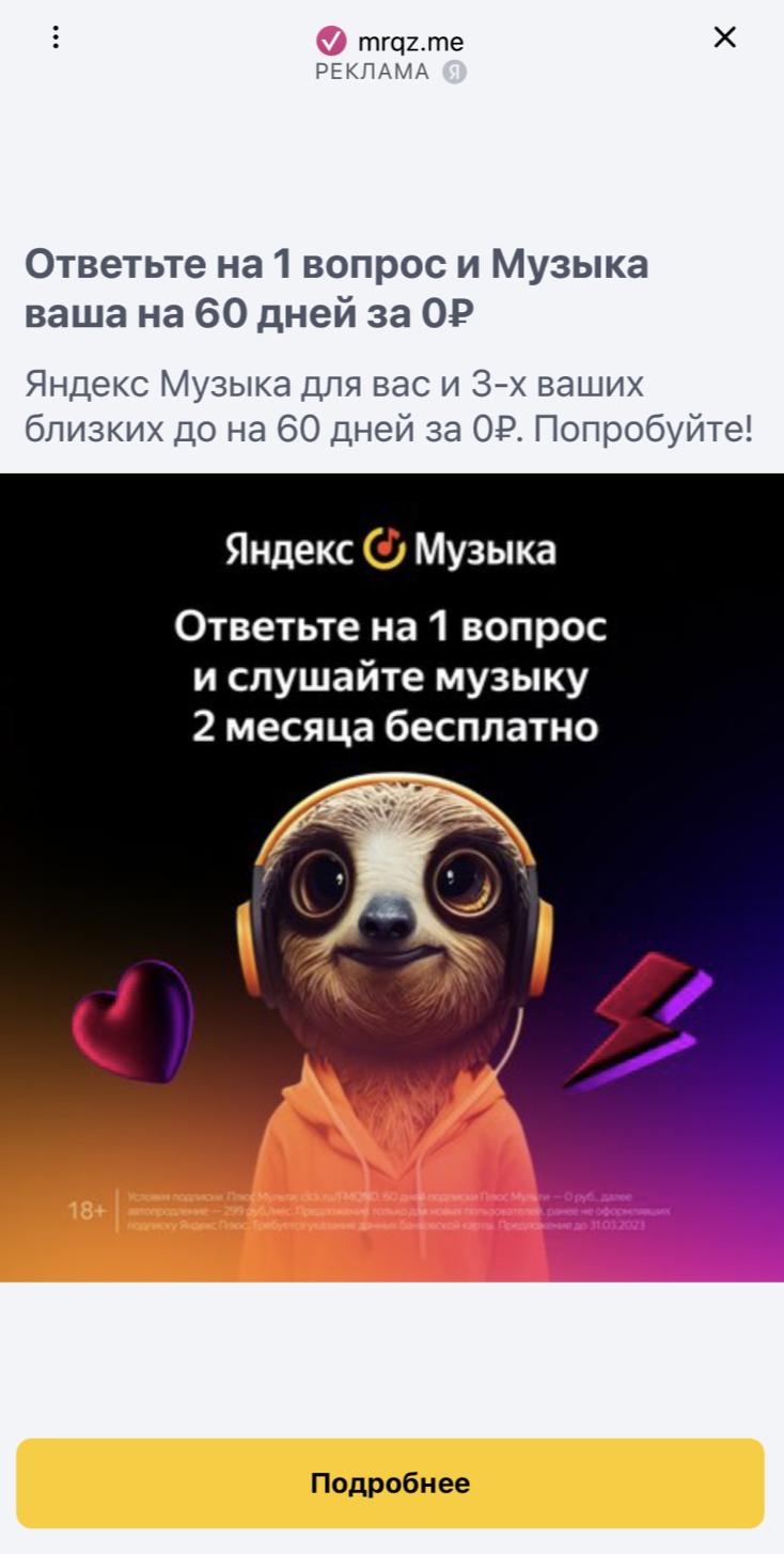 Угадай исполнителя с Яндекс.Музыкой. Музыкальный сервис использует геймификацию в рекламе — предлагает угадать исполнителей трёх песен. За правильный ответ вы получаете 60 бесплатных дней использования сервиса. Это нестандартный способ привлечь новых пользователей.