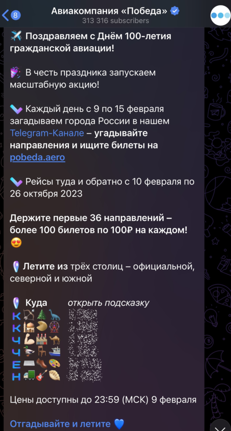 Авиакомпания «Победа» и игра в города. Подписчикам телеграм-канала предлагают угадывать города по эмодзи и получать скидки на билеты на эти направления. Акция посвящена 100-летию гражданской авиации.