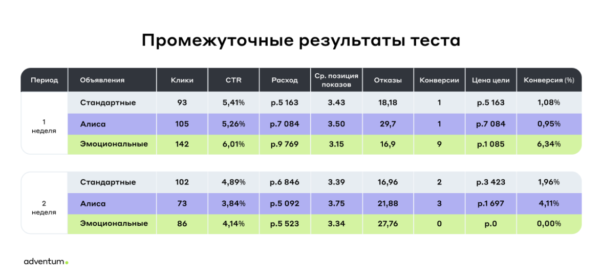 В первую неделю теста лидером стала группа «Эмоциональных» объявлений, написанных специалистом. Они показали наилучшие значения по ключевым метрикам:– CTR (отношение числа кликов к числу показов),– конверсия (доля пользователей, совершивших целевое действие после клика),– CPA (стоимость привлечения одного клиента).