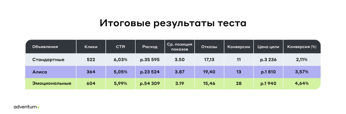 Конверсия — самая высокая среди всех трёх групп: 54% против 21% у «Стандартных» текстов и 25% у объявлений Алисы.
