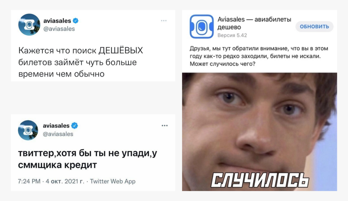 Бренд выбрал дерзкую стратегию ведения соцсетей. Несмотря на то, что Х одна из самых слабоактивных соцсетей в России, цитаты и скриншоты Авиасейлс разлетаются по всему интернету — тот самый вирусный контент, о котором мечтает каждый бренд.