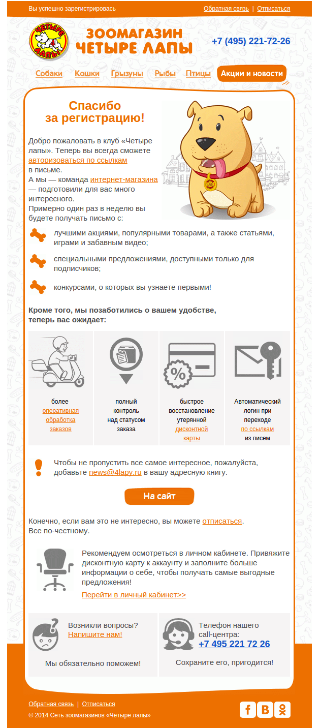 Зоомагазин «Четыре лапы» подготовил приветственную рассылку, уделив внимание всем нюансам: