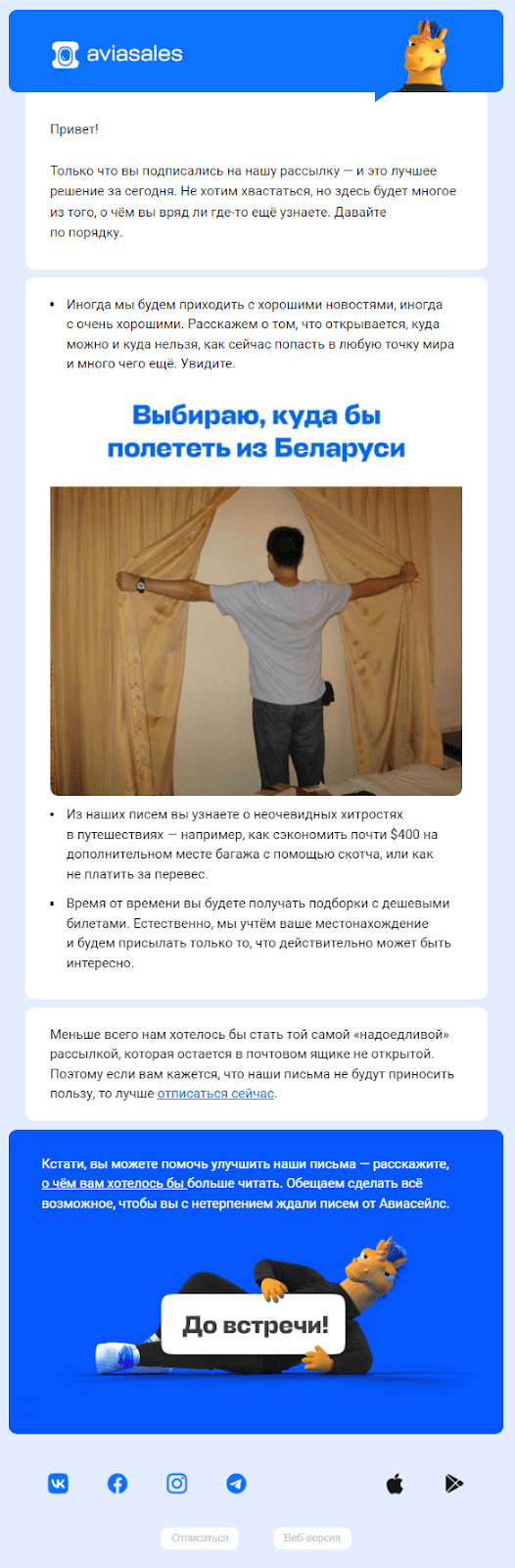 У Aviasales, сервиса для поиска дешевых авиабилетов, оригинальное приветственное письмо:
