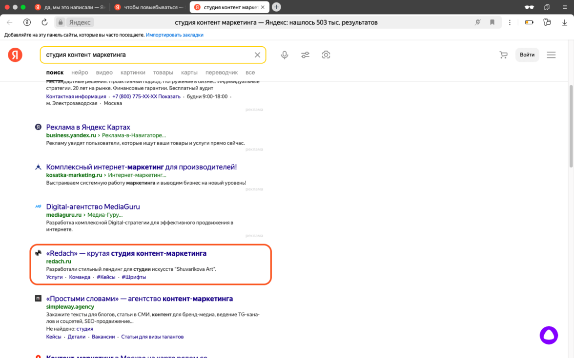 Мы в Redach обладаем богатым опытом и глубокими знаниями в области поискового продвижения. Нам удалось добиться офигительных результатов — сейчас мы находимся в топе поиска по высокочастотному запросу, то есть мы ПЕРВЫЕ в поиске по запросу «студия контент-маркетинга», после рекламы, естественно. Это как нельзя лучше подтверждает нашу компетентность в области SEO-продвижения. Пишите, если хотите так же.
