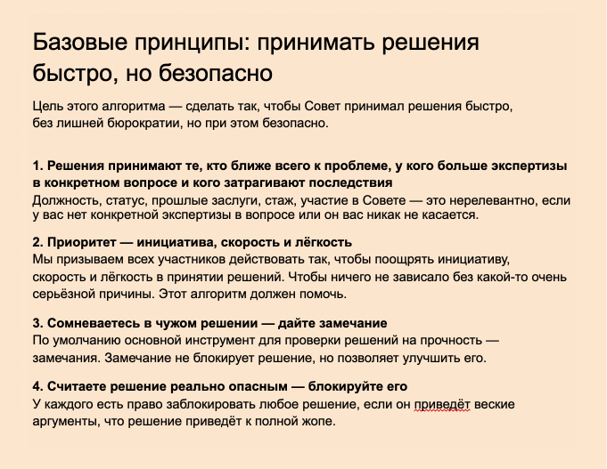 Чтобы обсуждения в Совете не затягивались, но и не приводили к проблемам, мы принимаем решения методом консента