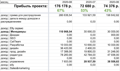 Отчётность живёт в Гугл-таблице, которая открыта для всех сотрудников, даже внештатных. Любой может зайти в файл и посмотреть, как дела у его команды или у всего агентства. Так мы реализуем наши ценности «честность» и «неудобная прозрачность».