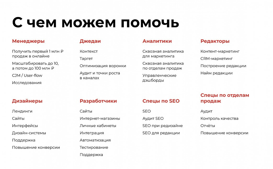 Сотрудники в направлениях объединены по специальностям. Направления работают как над клиентскими проектами, так и над внутренними проектами агентства. Например, редакторы выстраивают контент-маркетинг не только внешним заказчикам, но и реализуют контент-стратегию IT-Agency. А менеджеры, кроме работы над клиентскими задачами, готовят обучающий курс по специальности Product Marketing Manager.