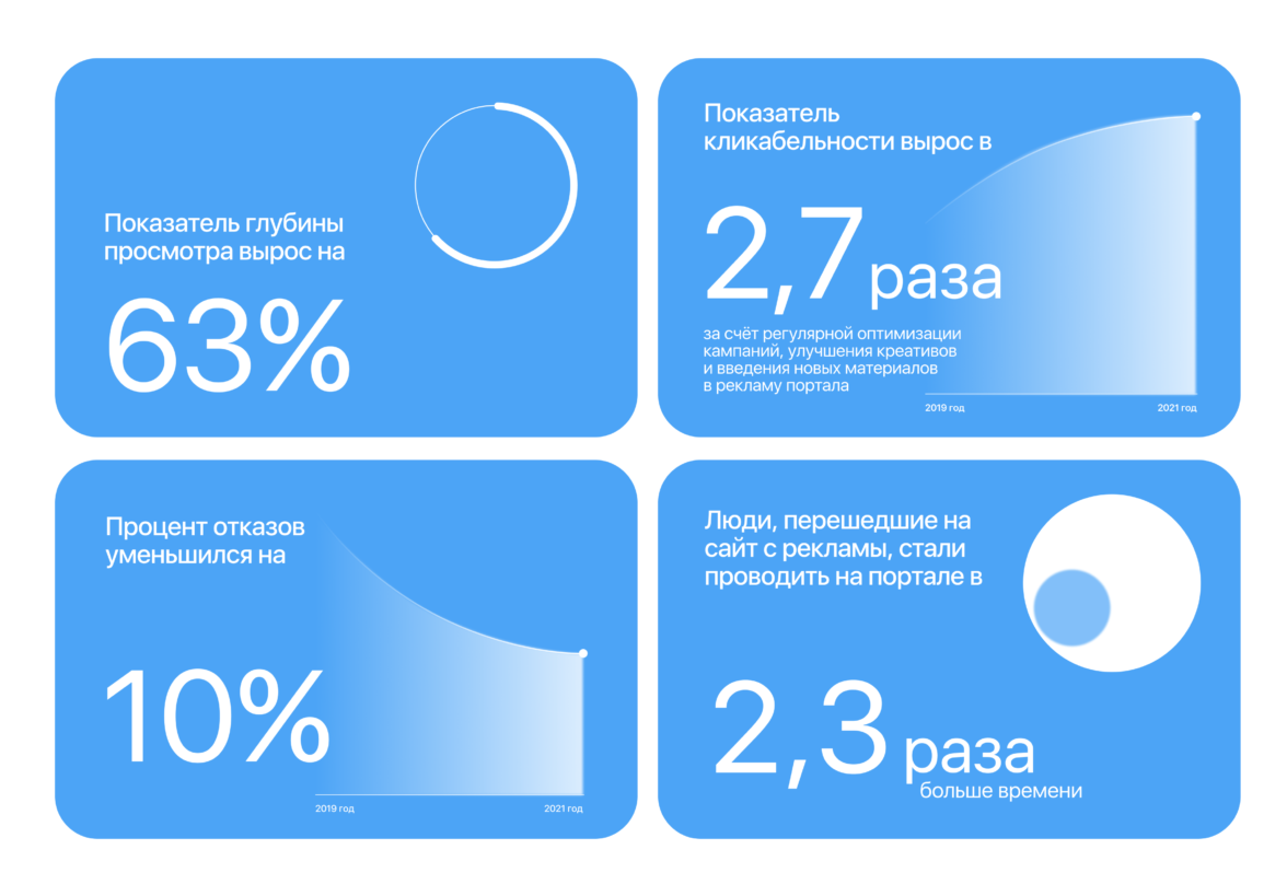 Разделение креативов и кампаний на несколько тематик — продвижение портала, курсов, статей и вебинаров. Это позволяет нам достигнуть всех целей, которые перед нами стоят: увеличить просмотры вебинаров, дочитывания статей, регистрации на портале.