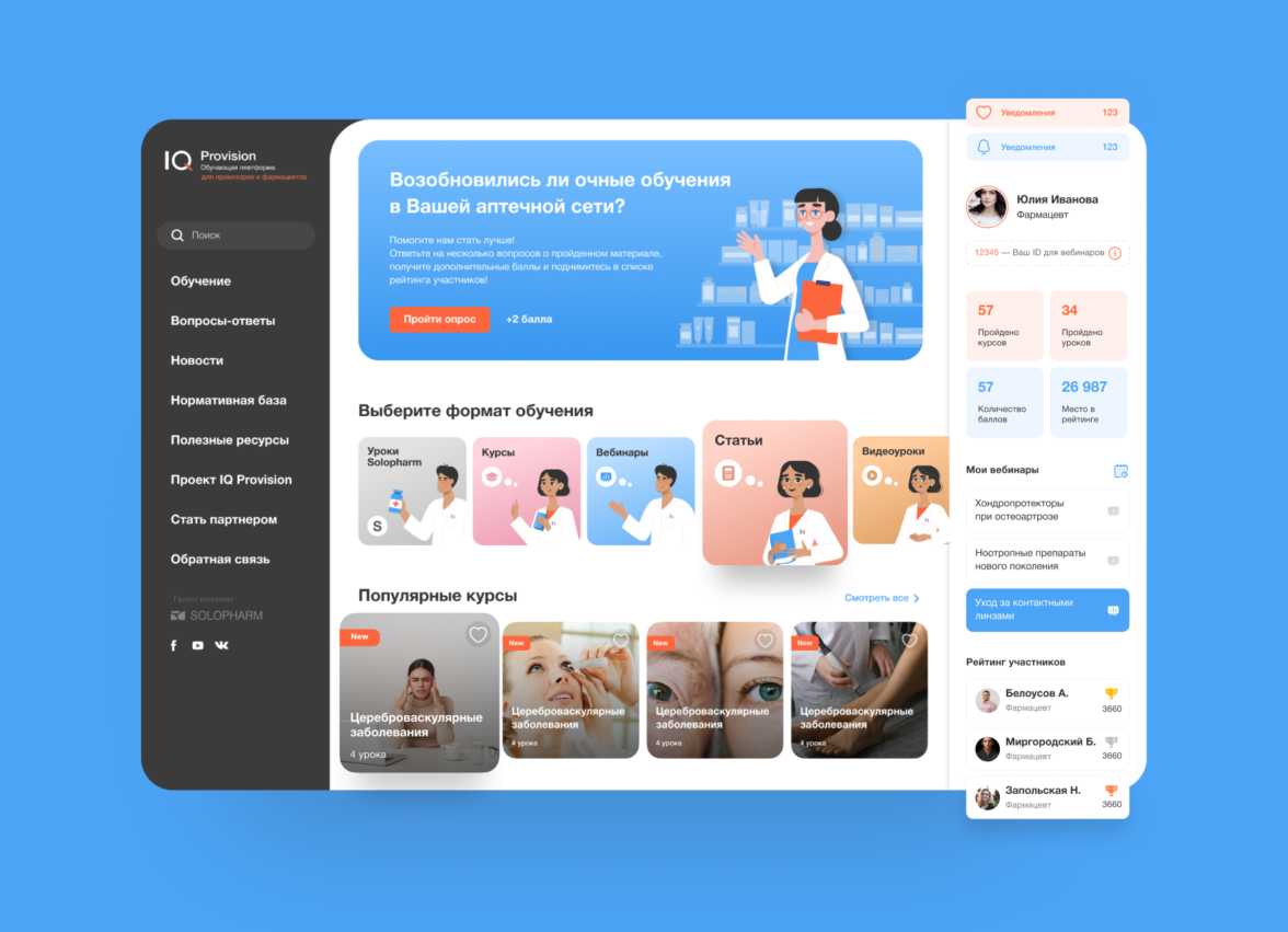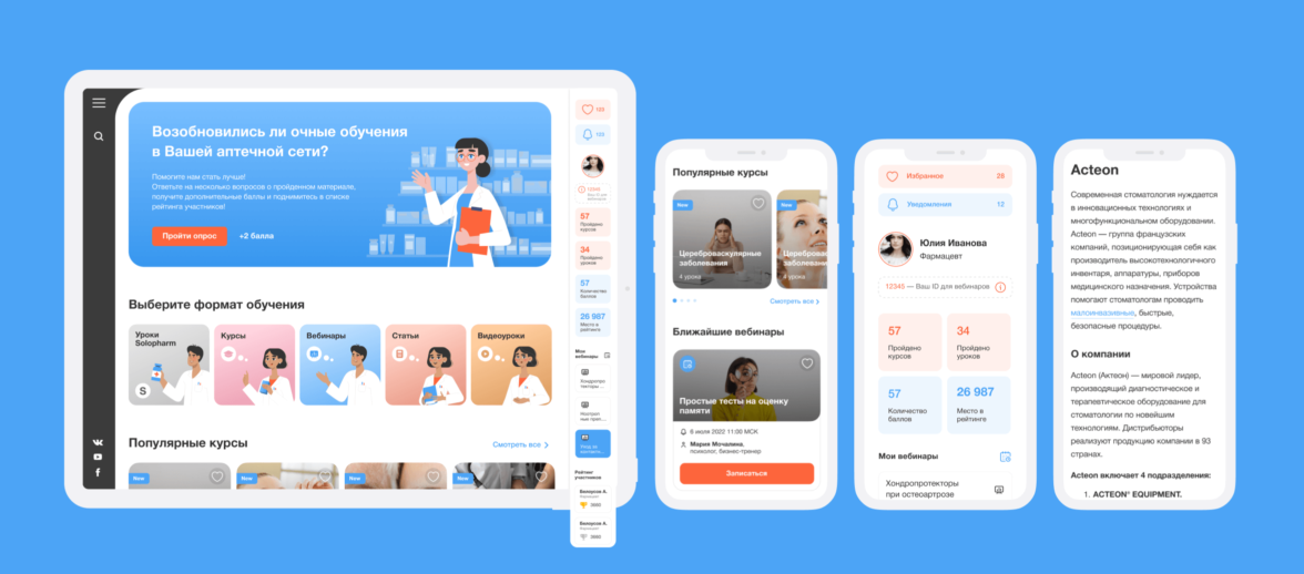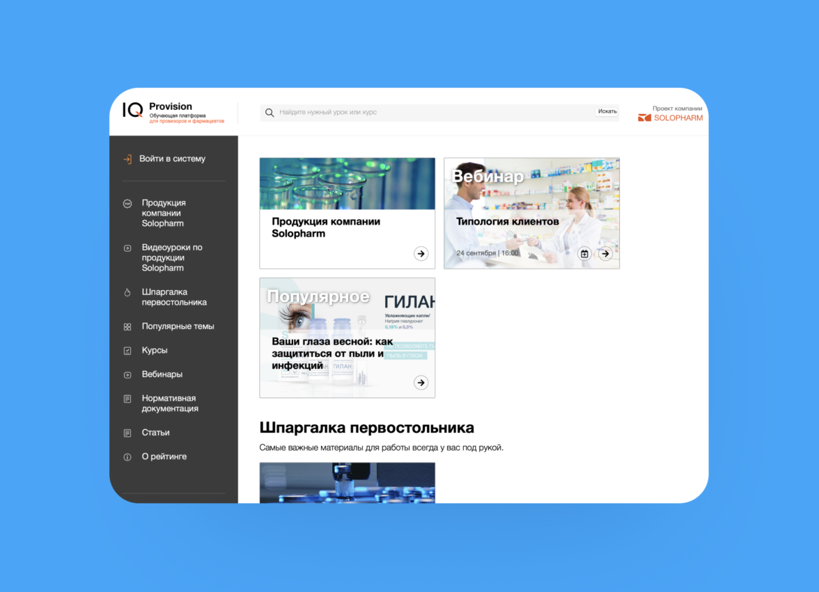 Перед нами стояла задача создать удобный, красивый и масштабируемый интерфейс образовательной платформы для провизоров и фармацевтов.