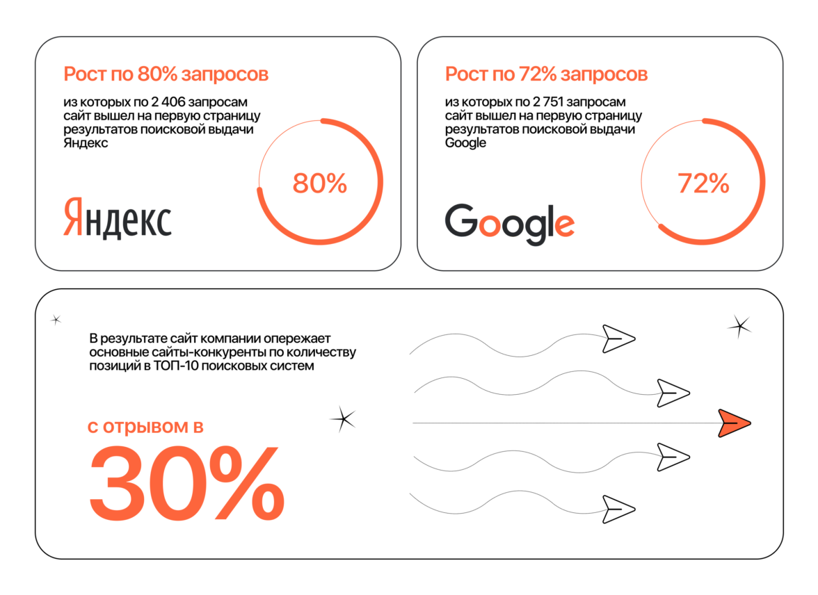 Но большей задачей стало повышение времени на сайте и других качественных показателей, снизившихся на 20–30 % на фоне ухода GoogleПоиск, который регулярно показывал лучшие результаты и самый большой процент трафика среди всех каналов.