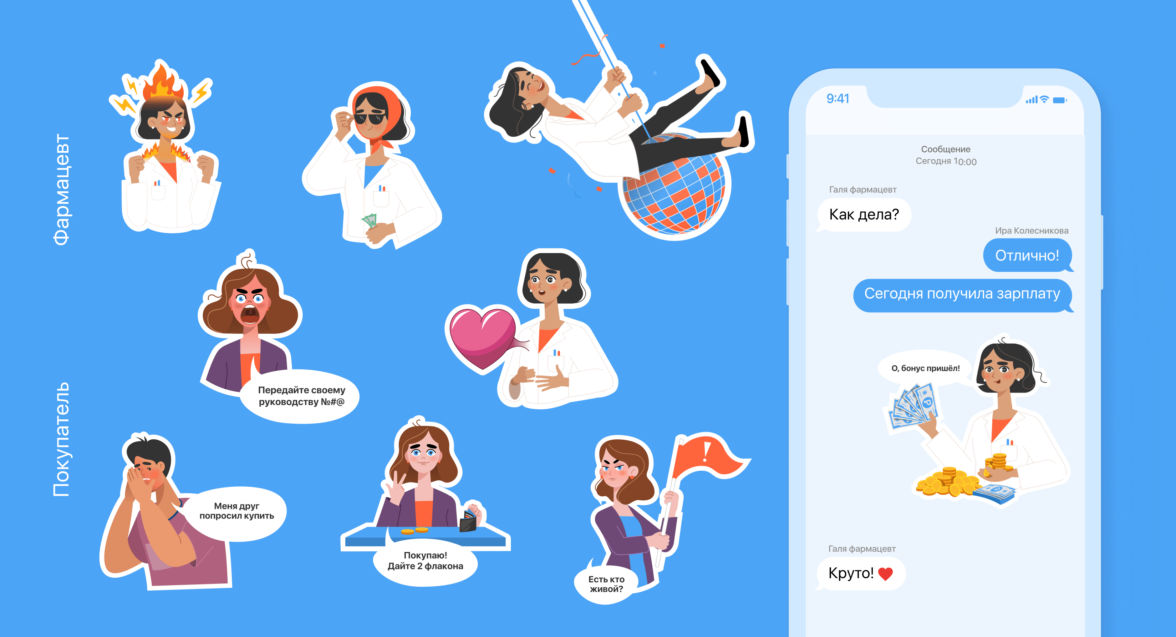 Для IQ Provision мы отрисовали фирменных персонажей: фармацевта и покупателя. Их эмоции и реакции хорошо знакомы не только профессиональному сообществу, но и многочисленным покупателям аптек. Вдохновленные юмором фармацевтического сообщества, мы создали стикерпак из 65 стикеров, иллюстрирующих забавные рабочие ситуации из жизни фармацевтов.