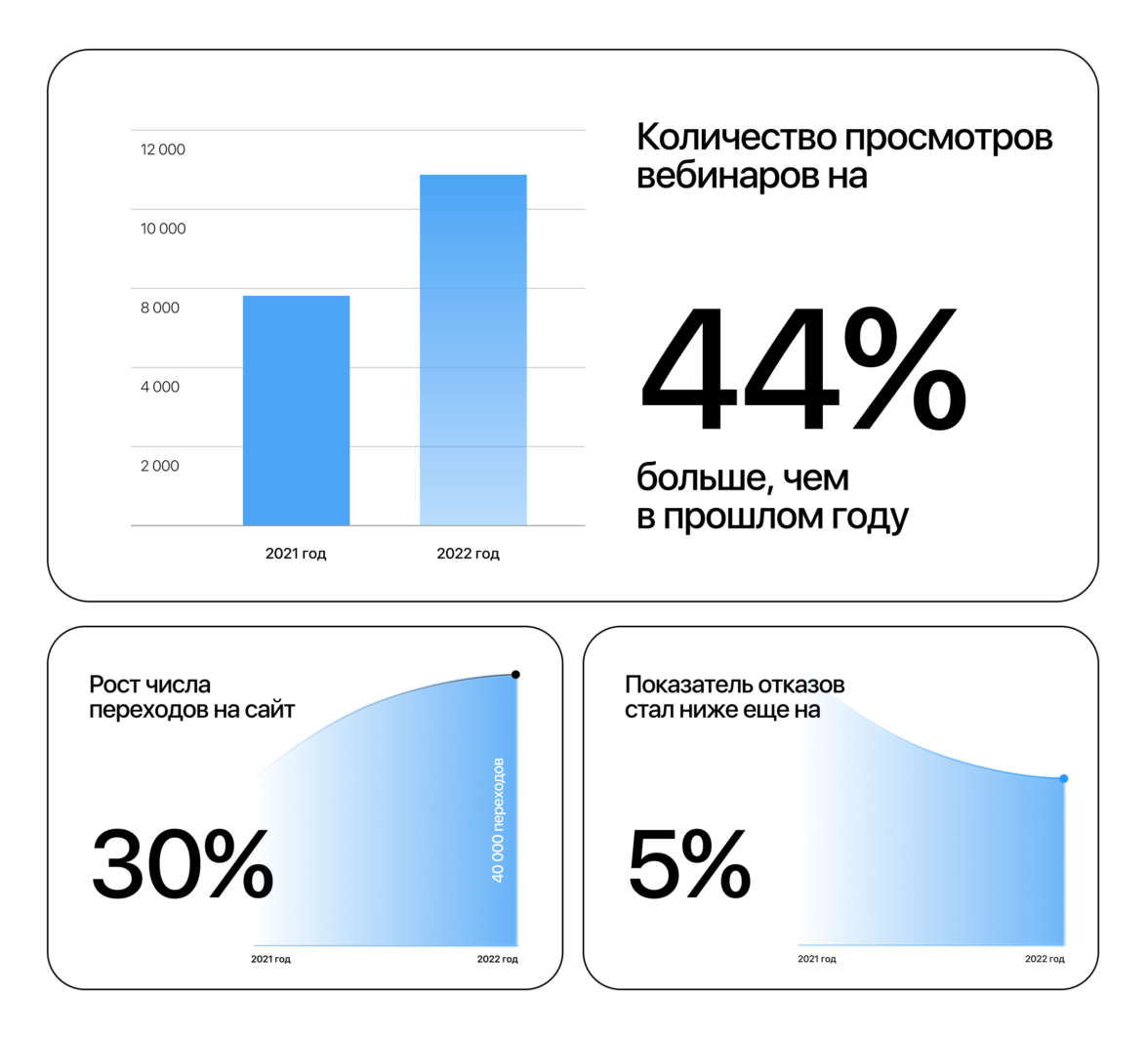 В 2022 году нашим основным KPI стал рост числа переходов на сайт на 30% по сравнению с прошлым годом, это более 40 000 переходов.Кроме того, мы зафиксировали качественные метрики поведения пользователей на сайте, рост которых также успешно обеспечиваем.