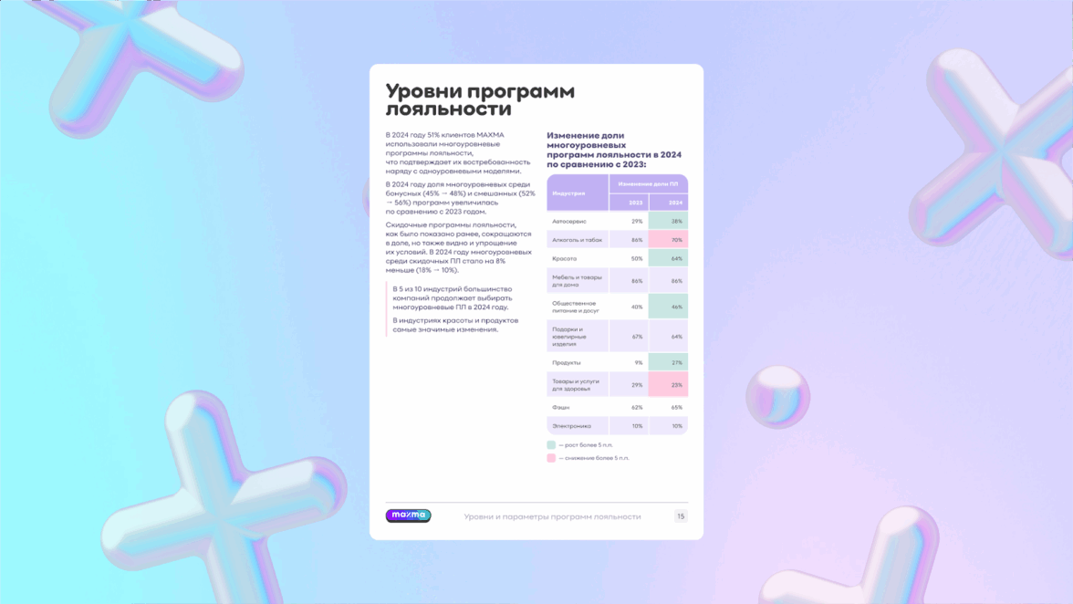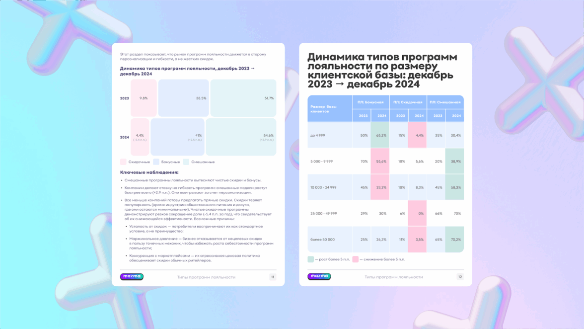 Если в прошлом году прямые скидки использовали почти 10% брендов, то сегодня только 4,4%. На смену им приходят смешанные программы: 55% компаний уже комбинируют скидки, бонусы, уровни и персонализированные поощрения.