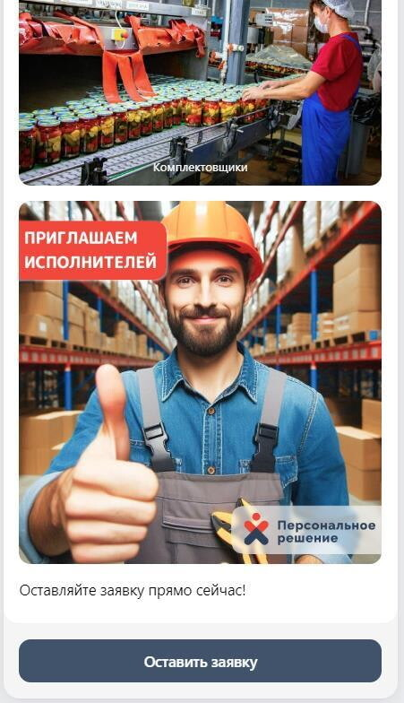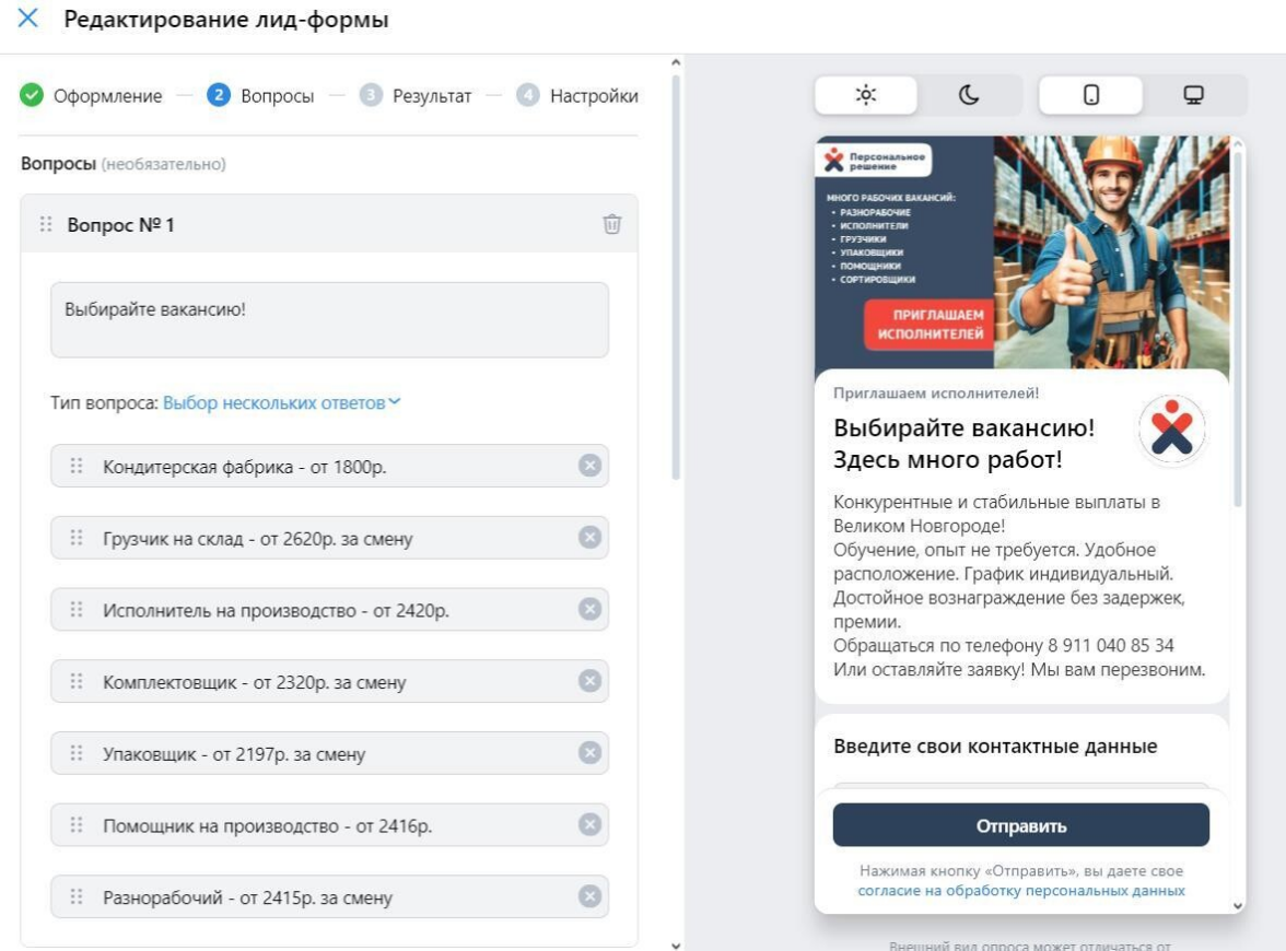 Чтобы максимизировать эффект от размещенных вакансий, мы решили подключить таргетированную рекламу VK. Мы создали лид-формы и мини-лендинги, которые предлагали кандидатам сразу выбрать подходящую вакансию и оставить свои контактные данные.