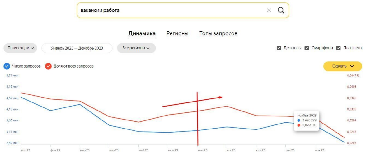 Когда «Персональное решение» разместило свои вакансии на Авито, они знали, что привлечение кандидатов в условиях высокой конкуренции будет нелегким делом. Первый шаг — анализ запросов с помощью Wordstat — показал, что интерес к поиску работы среди рабочих специальностей находится на подъеме. Это был знак, что пора принимать меры.