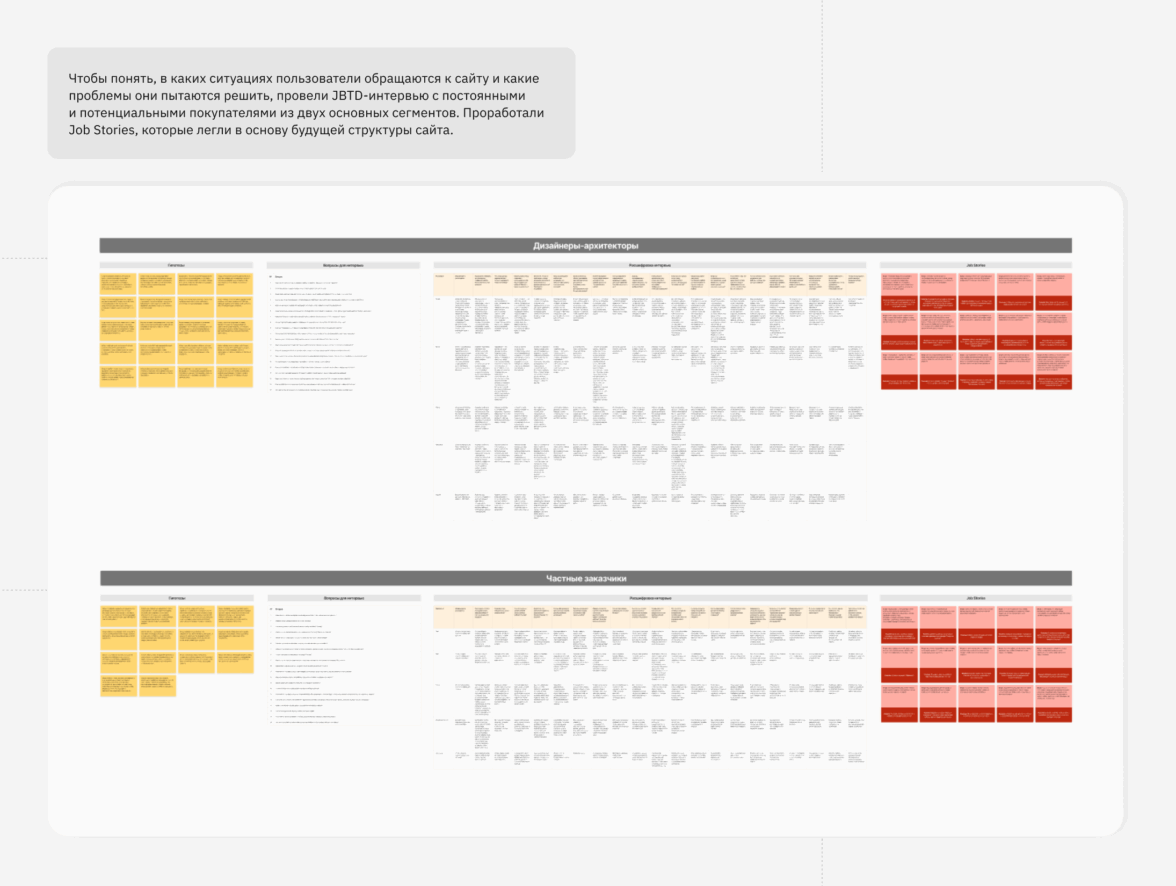Для того чтобы точно понять мотивы и потребности этих групп мы провели интервью с клиентами Novaroom, а также с дизайнерами и частными заказчиками, которые за последние полгода покупали мебель онлайн.