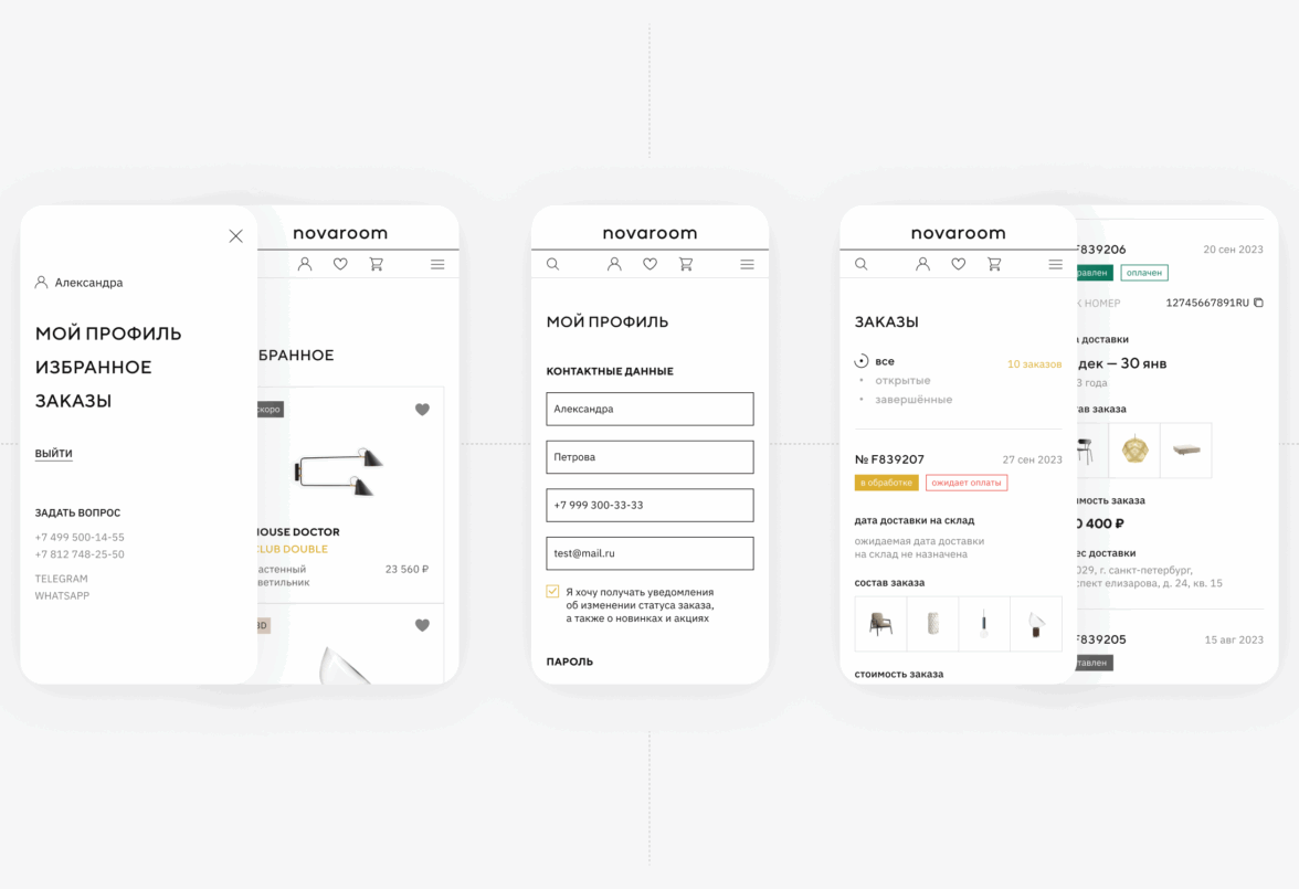 В личном кабинете пользователя сохраняются избранные товары, а также информация о текущих и прошлых заказах с указанием статуса и предварительного срока доставки. Подробная информация делает процесс покупки прозрачным и устраняет необходимость связываться напрямую с менеджером для уточнения деталей.