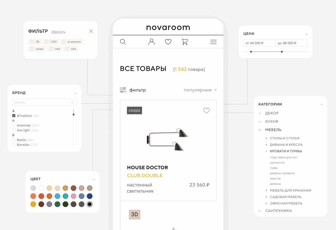 Благодаря фильтрации дизайнеры интерьеров могут быстро найти товары, соответствующие специфическим требованиям проекта, а частные заказчики легко ориентируются в широком ассортименте.
