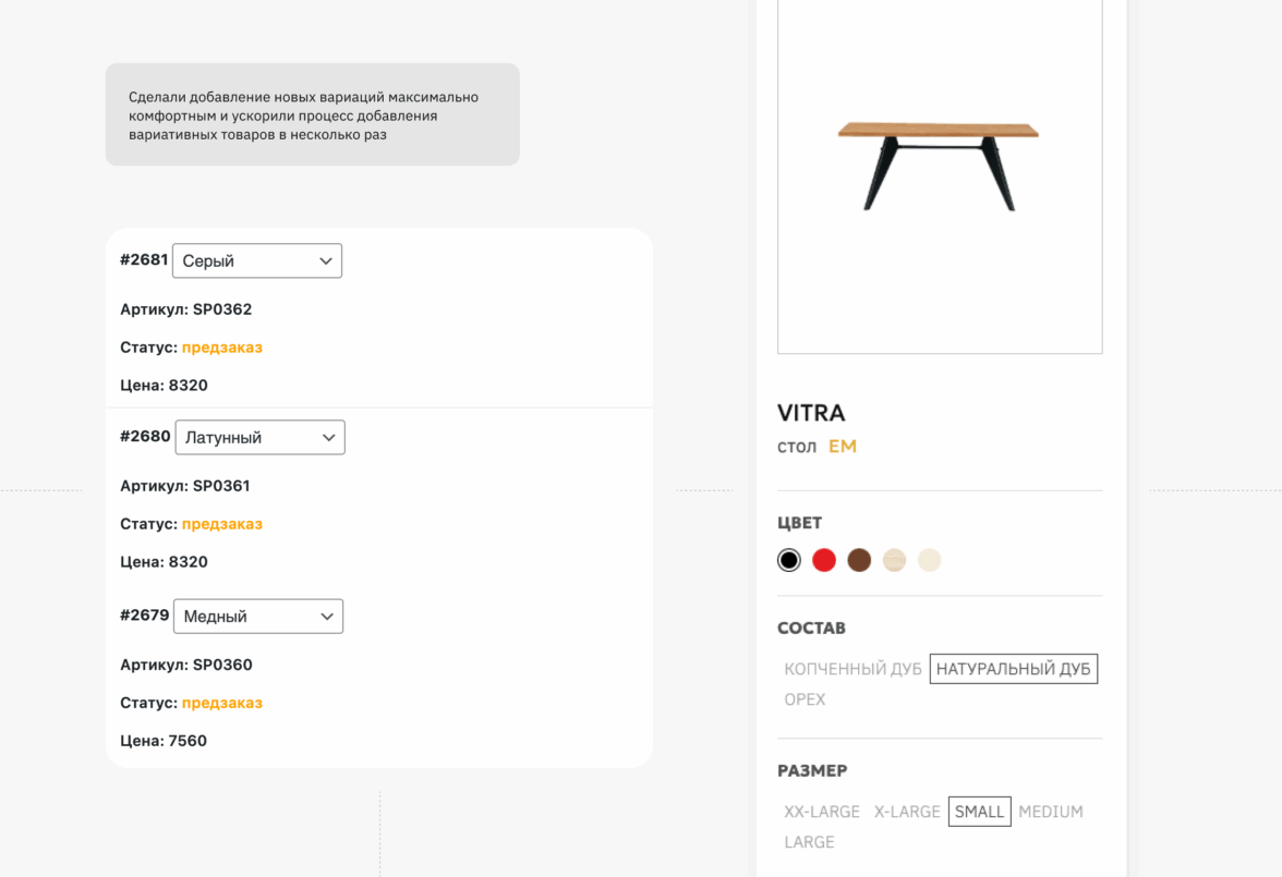 Мы проработали административную панель так, чтобы для менеджеров сайта добавление новых вариаций было максимально комфортным — вся информация хранится в основном товаре, а для вариации достаточно только указать ту характеристику, которая отличается.