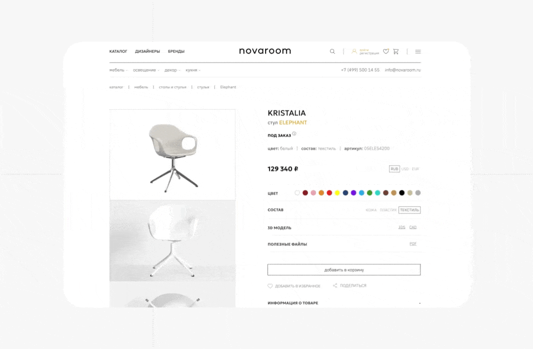 О каждом товаре представлена подробная информация, при этом основные характеристики выделены для удобства переключения между вариациями и быстрого доступа к важным файлам. Так информация о наличии 3D-модели вынесена в раздел с ключевыми характеристиками — важный момент для дизайнеров, которые отмечали отсутствие такой возможности на старом сайте Novaroom.