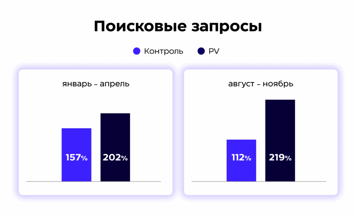 В первую очередь, мы посмотрели, как запуск медийных рекламных кампаний влияет на брендовые запросы и привлечение трафика на сайт. Это можно сделать как через отслеживание на регулярной основе динамики поисковых запросов в WordStat, так и через подключение SearchLift в Яндекс Direct.В нашем случае SearchLift запускались на регулярной основе, и мы видели, что после коммуникации с медийкой пользователи более активно переходили в поиск и вводили запросы, связанные с брендом «Мария».