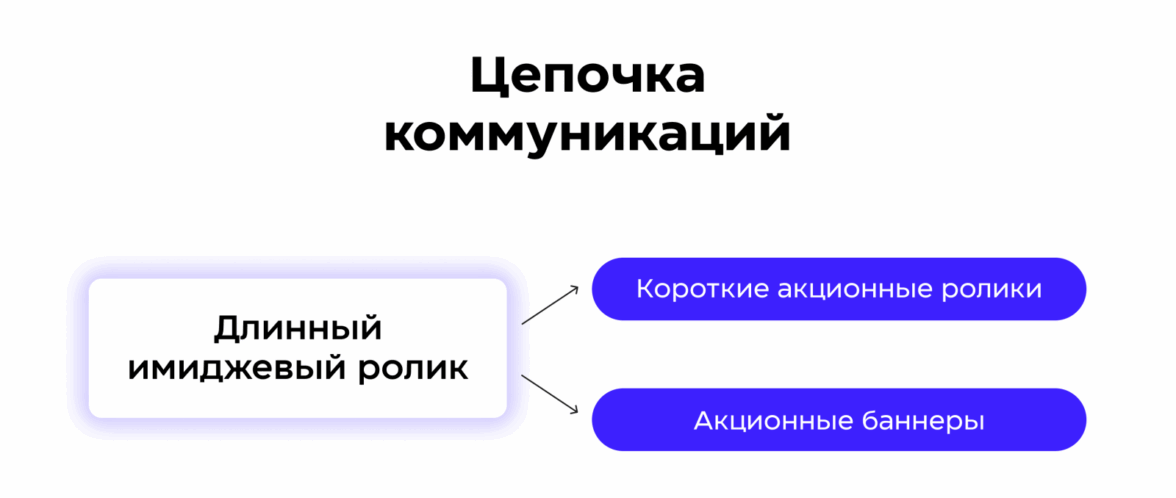 Механика флайтов была схожей. Цепочка коммуникации с пользователем начиналась с первого брендового контакта — мы показывали длинный имиджевый ролик. Этих пользователей мы не теряли: охватывали тех, кто был заинтересован в сообщении, через сбор отдельных сегментов пользователей — досмотревших 75% длинного креатива. После чего мы подогревали интерес к текущим акциям, показывая им акционные креативы — это были либо короткие ролики, либо баннеры.