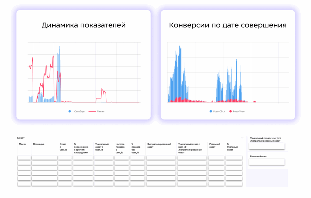 Если оценивать результаты этих флайтов на самом начальном стартовом уровне, то оба флайта показали себя крайне хорошо с точки зрения показов, кликов, просмотров и охвата. Но мы не стали останавливаться на этих показателях, а решили использовать методы более глубокой аналитики, чтобы понять, какой эффект на бренд был получен от этих медийных флайтов. Для лучшей интерпретации данных и получения прозрачной аналитики мы подключили кастомное решение — рost-view дашборд.