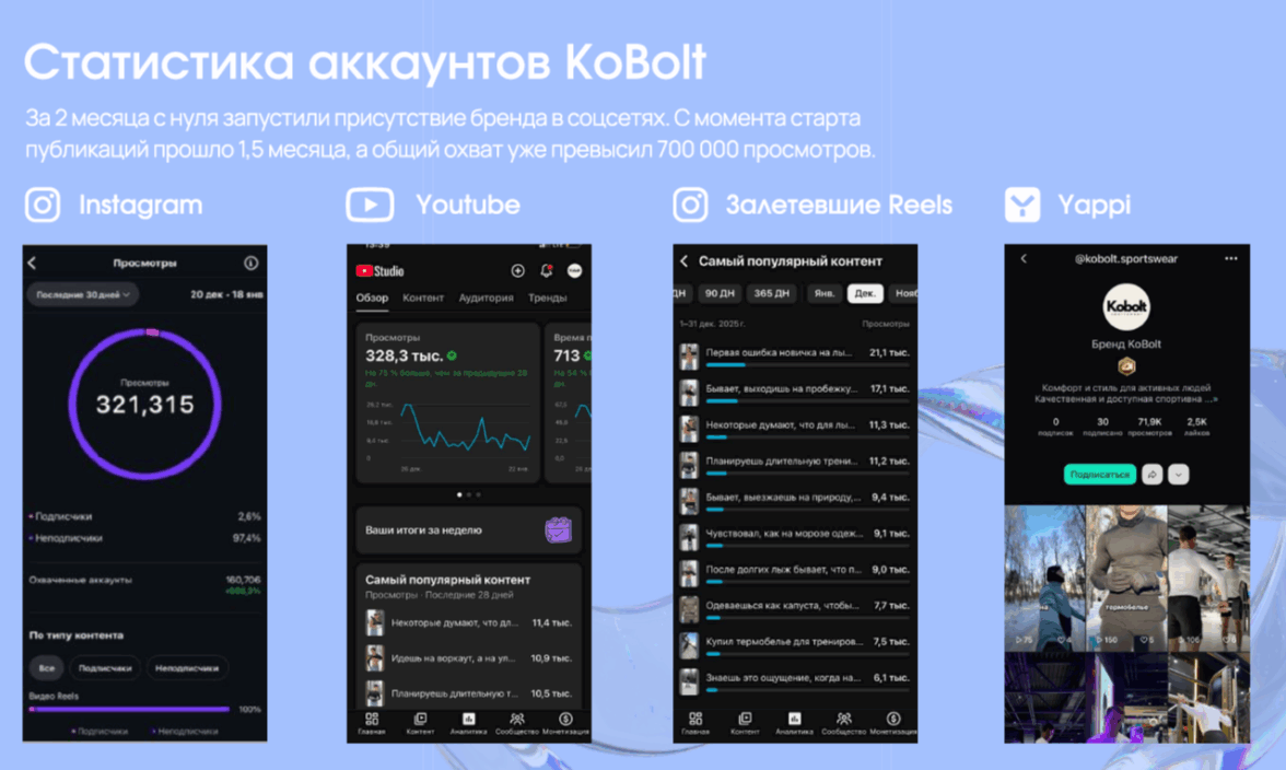 Перед брендом KoBolt стояла амбицитарная цель: обеспечить ежедневное присутствие в лентах TikTok, Reels и VK с качественным видеоконтентом для наращивания узнаваемости и охватов.