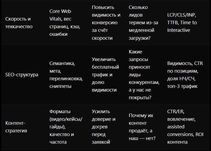 В 2025 году конкурентный анализ стал ещё глубже: к SEO и структуре добавились AI-оптимизация, доверие, мобильный опыт и вопросы безопасности данных. И именно здесь открываются возможности для тех, кто хочет обогнать рынок.