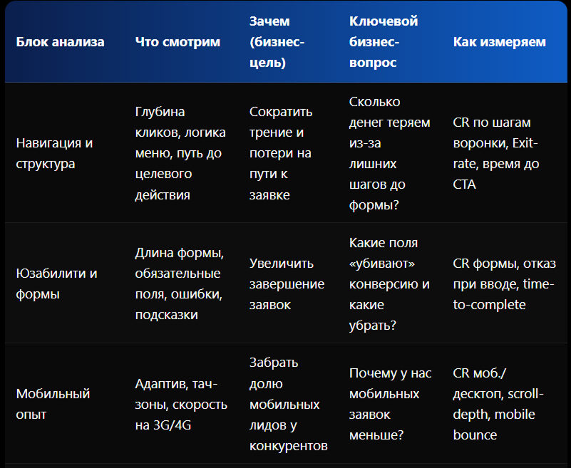 Здесь и кроется сила конкурентного анализа: задача не в том, чтобы переписать сайт конкурента «под копирку», а в том, чтобы понять, что действительно работает, а что — лишний балласт.