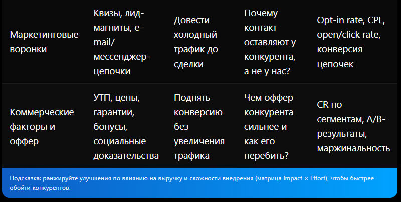 В этом и есть ценность: конкурентный анализ превращается не в список ошибок ради ошибок, а в практическое руководство — как обойти конкурента, не тратя деньги на то, что не работает даже у него самого.