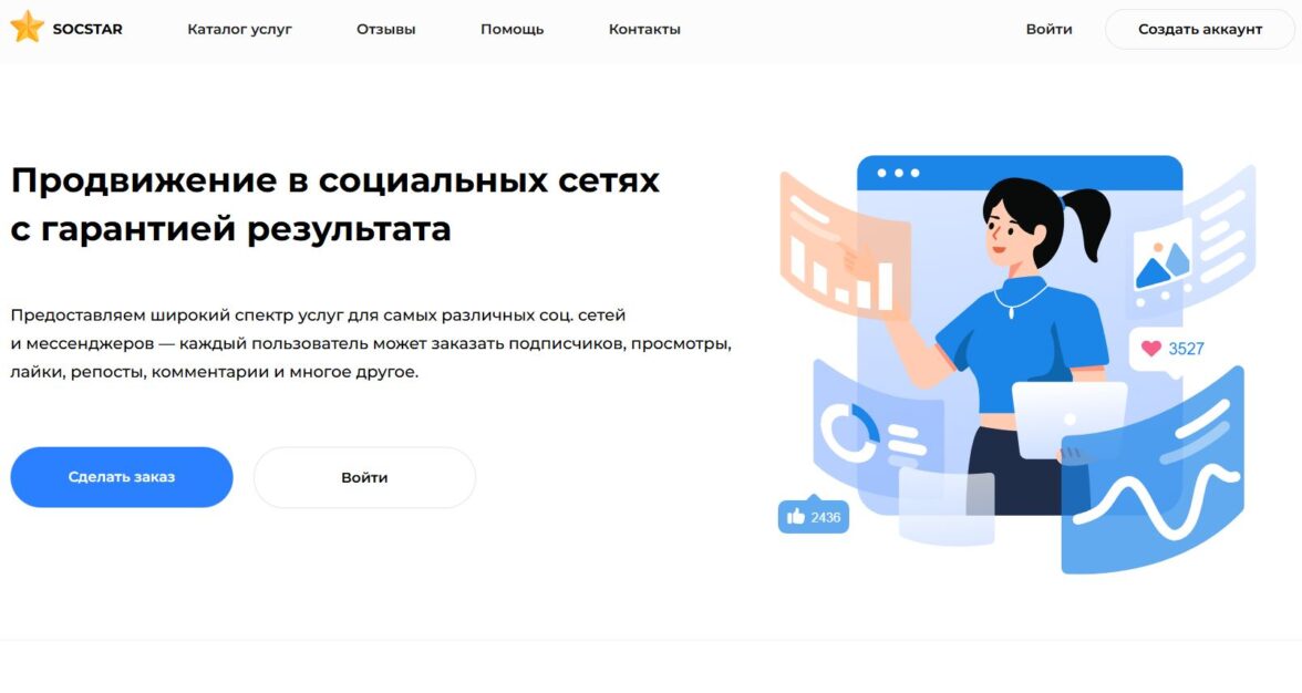 Socstar — сервис специализируется на привлечении живых пользователей из России и СНГ. Клиенты хвалят детальные отчёты по каждому заказу и прозрачность расчётов. Есть возможность протестировать небольшой пакет перед масштабной закупкой. Техподдержка консультирует по всем вопросам, а отзывы говорят о стабильном приросте активности без рисков для аккаунта.