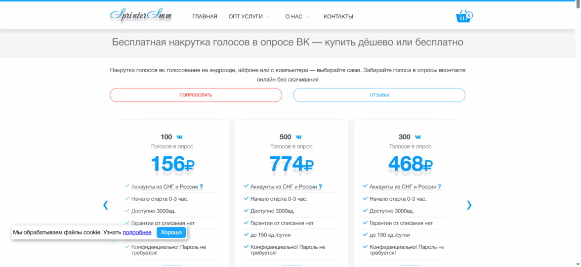 Простоспец.рф — площадка для недорогого привлечения голосов в ВК. Сервис отличается простым интерфейсом и моментальным стартом. Пользователи отмечают, что мнения остаются на аккаунте надолго, а не исчезают через пару дней. Есть система скидок. Техподдержка доступна круглосуточно, а отзывы говорят о надёжности сервиса.
