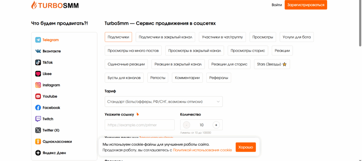 Turbosmm — сервис специализируется на массовом привлечении трафика за короткие сроки. Пользователи отмечают, что мнения приходят от живых людей, а не от ботов. Есть возможность выбрать регион аудитории. Техподдержка помогает настроить заказ под ваши цели, а отзывы подтверждают стабильность результатов.