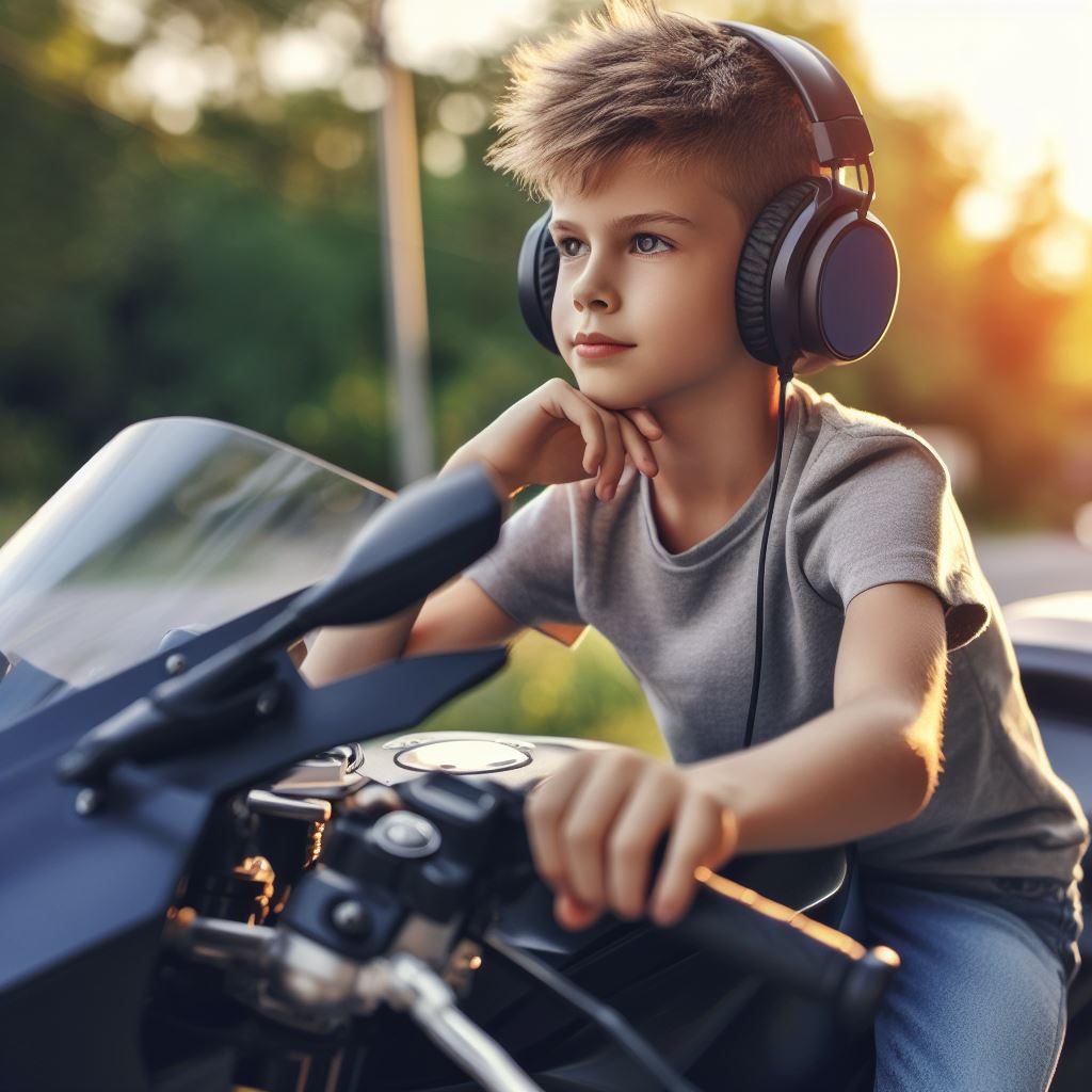 Запрос: «Фотография, мальчик едет на спортивном мотоцикле и слушает музыку»